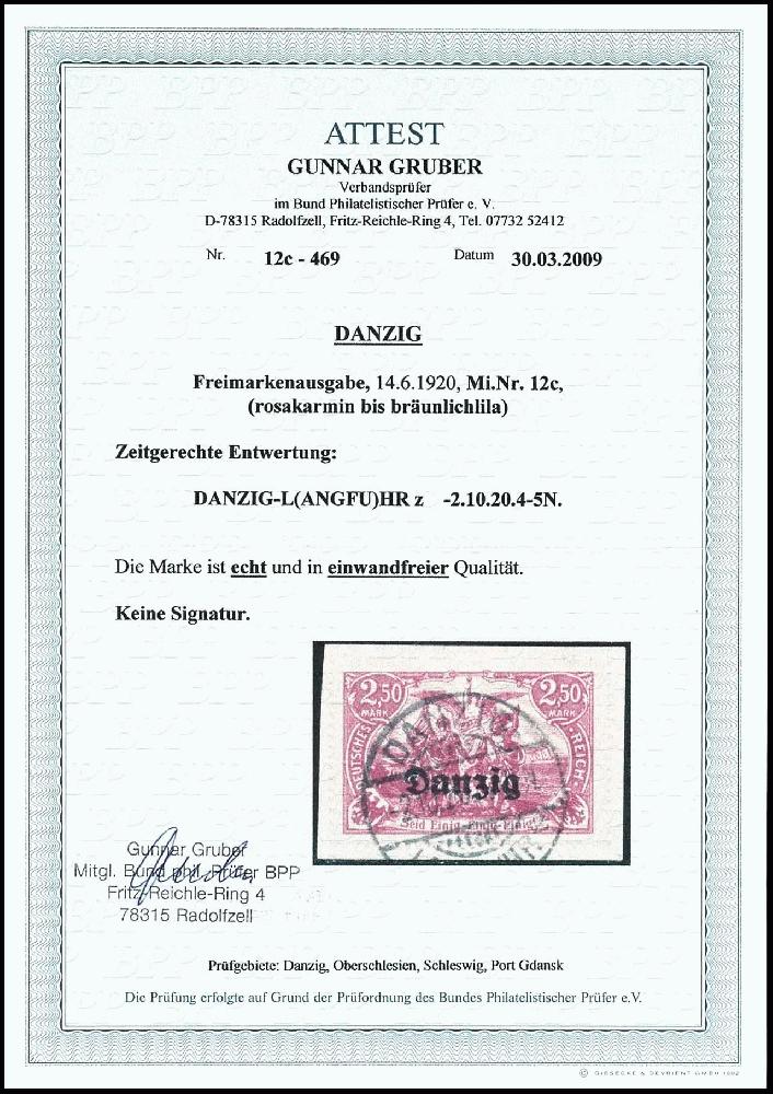 | Zusatzinformationen und Suchstichworte: | Dr. Reinhard Fischer 192. Auktion 19. - 20. Mai 2023 Los 1437 Danzig 2,50 Mark mit schwarzem Bdr.-Aufdruck "Danzig", rosakarmin, zeitgerecht entwertet "Danzig Langfuhr z 2.10.20", tadellose Erhaltung, Fotoattest Gruber BPP: "echt und einwandfrei", Mi. 900 Ausruf 140,00 EUR |