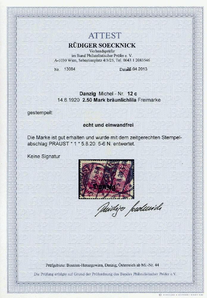 | Zusatzinformationen und Suchstichworte: | Veuskens 121. Auktion 10. - 11. August 2023 Los 1713 Danzig 2,50 Mark Germania 1920, in c.-Farbe, zeitgerecht gest. 'Praust 5.8.1920', Farbfotoattest Soecknick BPP 'echt und einwandfrei', Kabinett. M€ 900,-- Ausruf 150,00 EUR |