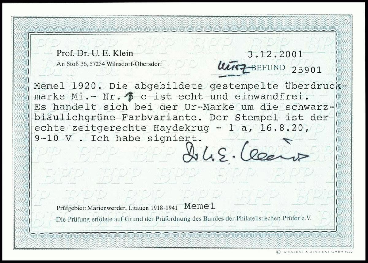 | Zusatzinformationen und Suchstichworte: | Dr. Reinhard Fischer 192. Auktion 19. - 20. Mai 2023 Los 1582 Memel 5 Pfennig Germania, schwärzlichbläulichgrün mit Aufdruck "Memelgebiet", entwertet Heydekrug 16.8.20", seltene Farbe, Fotobefund Prof. Dr. U. E. Klein BPP: "echt und einwandfrei", Mi. 280.- Ausruf 70,00 EUR |