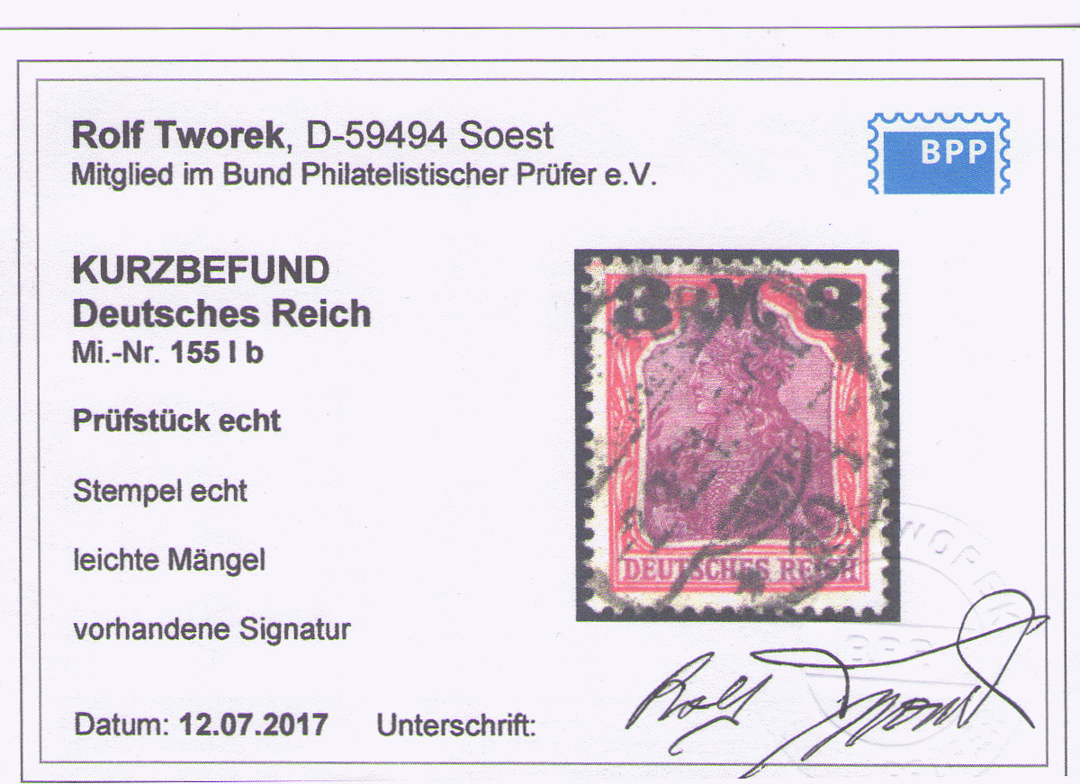 | Prüfer: | Tworek, Rolf (BPP (Bund Philatelistischer Prüfer)) |