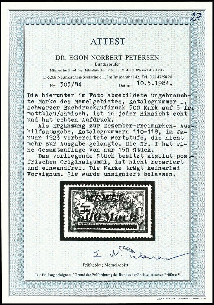 | Zusatzinformationen und Suchstichworte: | Dr. Reinhard Fischer 192. Auktion 19. - 20. Mai 2023 Los 1593 Memel Nicht ausgegeben: 500 Mark auf 5 Franc, postfrisch in tadelloser Erhaltung, geringe Auflage, Fotoattest Dr. Petersen BPP, Mi. 3.000.- - sehr seltene und kaum einmal angebotene Marke! In unserer 189. Auktion erzielte ein gleichwertiges Exemplar 1.700.- Euro zzgl. Aufgeld! Ausruf 1.500,00 EUR |