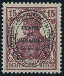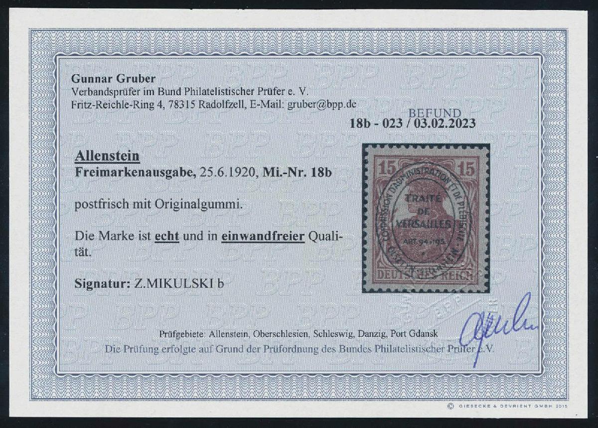 | Zusatzinformationen und Suchstichworte: | HBA 81. Auktion 11. - 13. Mai 2023 Los 1183 (D) Allenstein 1920, Germania mit Ovalaufdruck, 15 Pfg., karminbraun, tadellos postfrisches Kabinettstück, gepr. Mikulski und gepr. Gruber mit neuem Fotobefund, Mi. 250,-- Zuschlag 55,00 EUR |