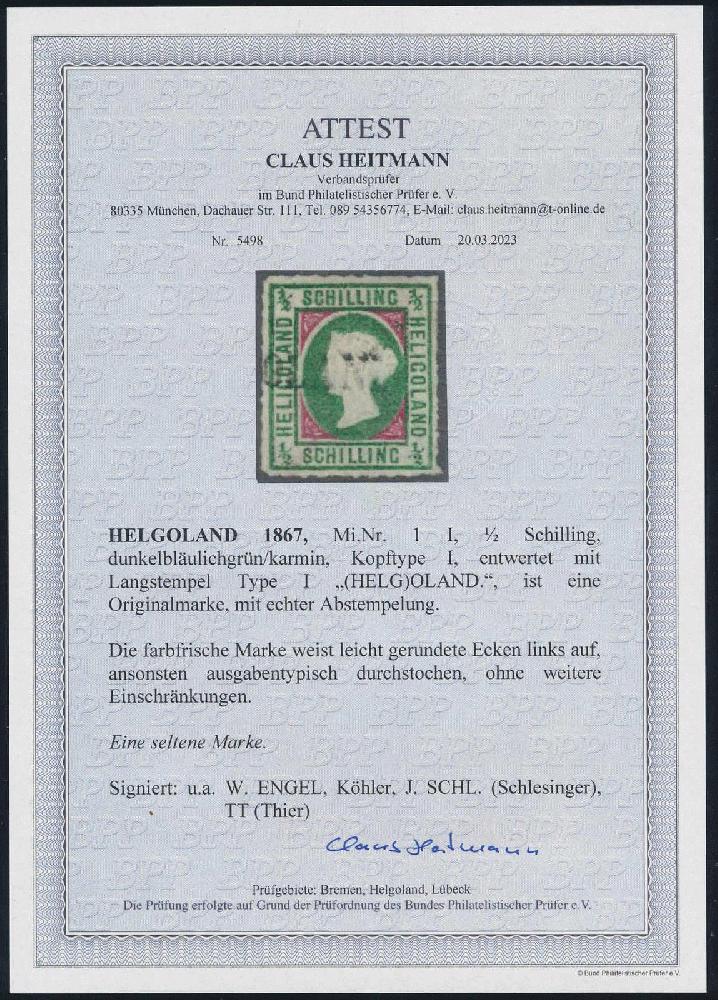 | Zusatzinformationen und Suchstichworte: | HBA 81. Auktion 11. - 13. Mai 2023 Los 653 (D) Altdeutschland Helgoland 1867, 1/2 Sch., dunkelbläulichgrün/karmin, Kopftype I, links winzig gerundete Ecken, sonst sehr gut durchstochen und klar entwertet mit Langstempel Type I, im Übrigen tadellose Kabinetterhaltung, schönes und sauberes Stück der seltenen Marke, div. Altsignaturen und gepr. Heitmann mit neuem Fotoattest, Mi. 1300,-- Zuschlag 270,00 EUR |