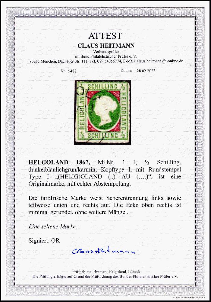 | Zusatzinformationen und Suchstichworte: | Württembergisches Auktionshaus 142. Versteigerung 23.-24. Juni 2023 Los 2621 Altdeutschland Helgoland ½ Sch. dunkelbläulichgrün/karmin, Kopftype I, farbfrisches Exemplar (Scherentrennung sowie re. oben leichte Eckrundung), sauber gestempelt, Fotoattest Heitmann BPP ("Seltene Marke") Zuschlag 270,00 EUR |
