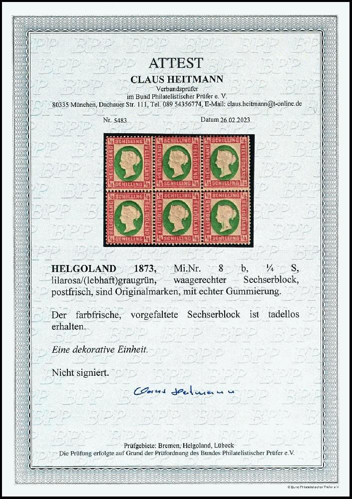 | Zusatzinformationen und Suchstichworte: | Dr. Reinhard Fischer 192. Auktion 19. - 20. Mai 2023 Los 99 Altdeutschland Helgoland 1/4 S. lilarosa/graugrün, waagerechter 6er-Block, postfrisch, vorgefaltet, tadellos, Fotoattest Heitmann BPP Zuschlag 200,00 EUR |