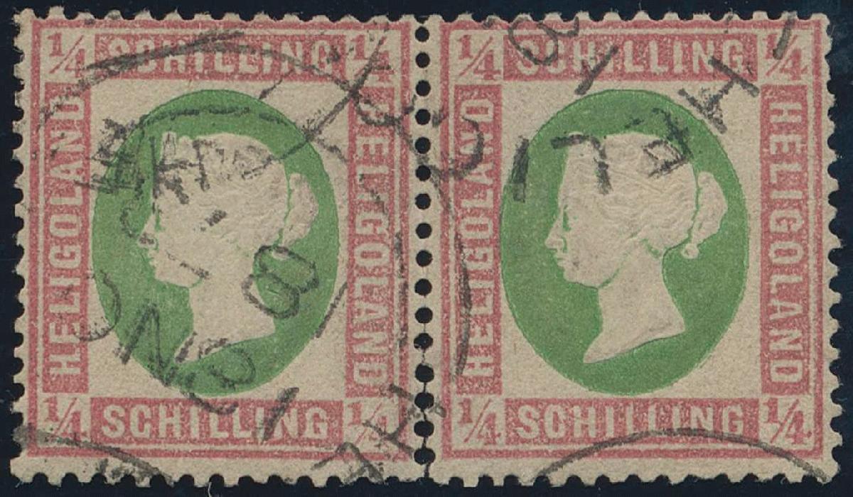 | Zusatzinformationen und Suchstichworte: | HBA 81. Auktion 11. - 13. Mai 2023 Los 663 (D) Altdeutschland Helgoland 1873, 1/4 Sch., lilarosa/(lebhaft)graugrün, waagerechtes Paar, unten ca. 1/3 angetrennt, mehrfach entwertet mit Rundstempel Type I "HELIGOLAND 18 NO 1873", die linke Marke zeigt Reparaturen, die rechte geringe, unerhebliche Zähnungsunebenheiten, im Übrigen saubere Prachterhaltung, Paare dieser Marke sind äußerst selten, es sind laut Attest nur wenige gestempelte Paare bekannt, Altsign., Fotoattest Schulz und gepr. Heitmann mit neuem Fotoattest, Mi. 7500,-- Zuschlag 900,00 EUR |