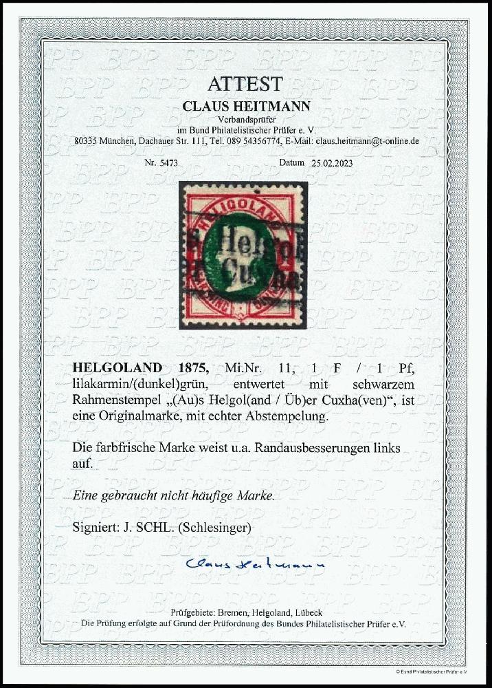 | Zusatzinformationen und Suchstichworte: | Dr. Reinhard Fischer 192. Auktion 19. - 20. Mai 2023 Los 101 Altdeutschland Helgoland 1 F/ 1Pfg. lilakarmin/grün, mit Ra 2 "Aus Helgoland über Cuxhaven", u.a. links Randausbesserungen, sign. Schlesinger, Fotoattest Heitmann BPP, Mi. 900.- Zuschlag 100,00 EUR |
