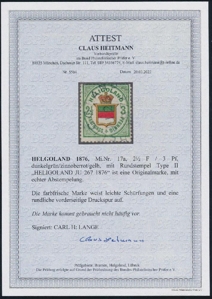 | Zusatzinformationen und Suchstichworte: | HBA 81. Auktion 11. - 13. Mai 2023 Los 666 (D) Altdeutschland Helgoland 1876, 2 1/2 F./3 Pfg., dunkelgrün/(bräunlich)gelb/ zinnoberrot, sauber gestempelt mit Rundstempel Type II "HELIGOLAND JU 26 1876", die Marke weist geringe Schürfungen und eine leichte rundliche Druckspur auf, im Übrigen fehlerfreie Prachterhaltung, echt gebraucht eine seltene Marke, Altsign. und gepr. Heitmann mit neuem Fotoattest, Mi. 2000,-- Zuschlag 400,00 EUR |