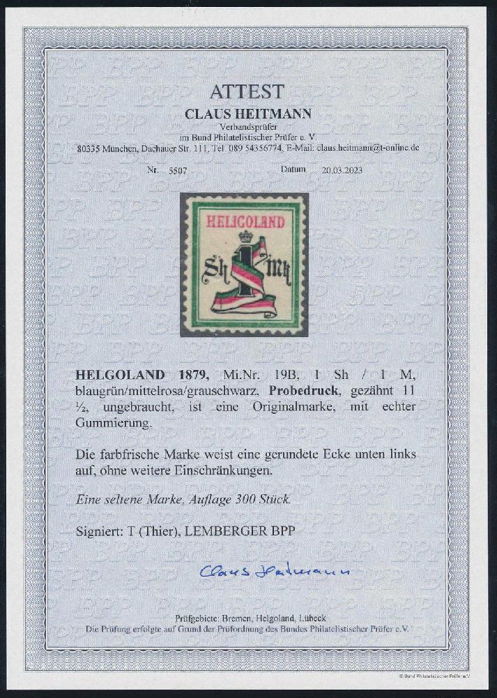 | Zusatzinformationen und Suchstichworte: | HBA 81. Auktion 11. - 13. Mai 2023 Los 670 (D) Altdeutschland Helgoland 1879, 1 Sh./1 Mk., blaugrün/mittelrosa/grauschwarz, Probedruck mit Linienzähnung 11 1/2, ungebraucht mit vollem Originalgummi und Falzresten, links unten minimal eckrund, vermutlich der Linienzähnung geschuldet, sonst tadellose Kabinetterhaltung, sehr seltene Marke, die Auflage betrug nur 300 Stück, Altsign., gepr. Lemberger mit Fotoattest und gepr. Heitmann mit neuem Fotoattest, Mi. 1800,-- Ausruf 450,00 EUR |