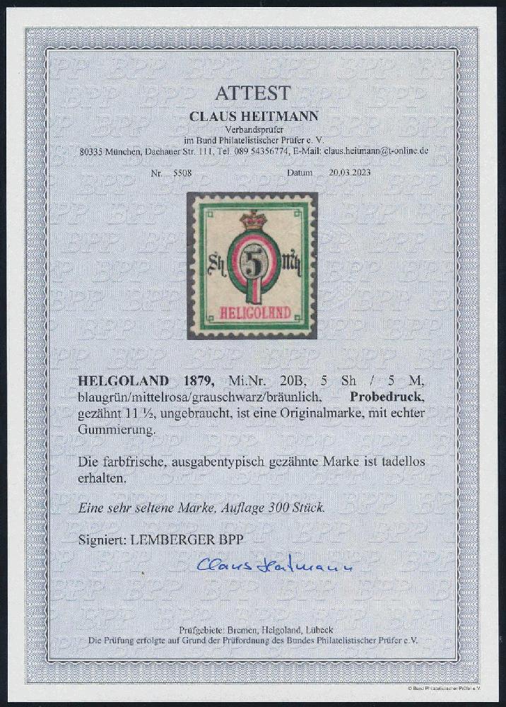 | Zusatzinformationen und Suchstichworte: | HBA 81. Auktion 11. - 13. Mai 2023 Los 672 (D) Altdeutschland Helgoland 1879, 5 Sh./5 Mk., blaugrün/mittelrosa/grauschwarz/bräunlich, Probedruck mit Linienzähnung 11 1/2, ungebraucht mit vollem Originalgummi und Falzresten, tadellose Kabinetterhaltung, sehr seltene Marke, die Auflage betrug nur 300 Stück, Altsign., gepr. Lemberger mit Fotoattest und gepr. Heitmann mit neuem Fotoattest, Mi. 1800,-- Zuschlag 500,00 EUR |