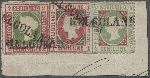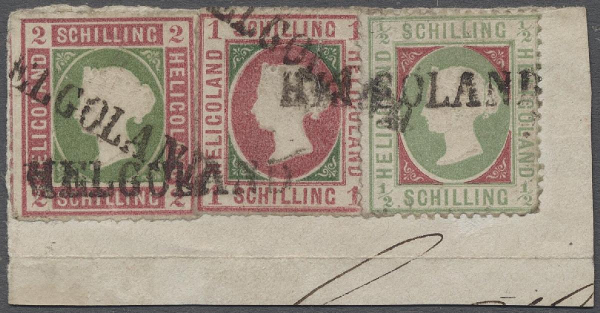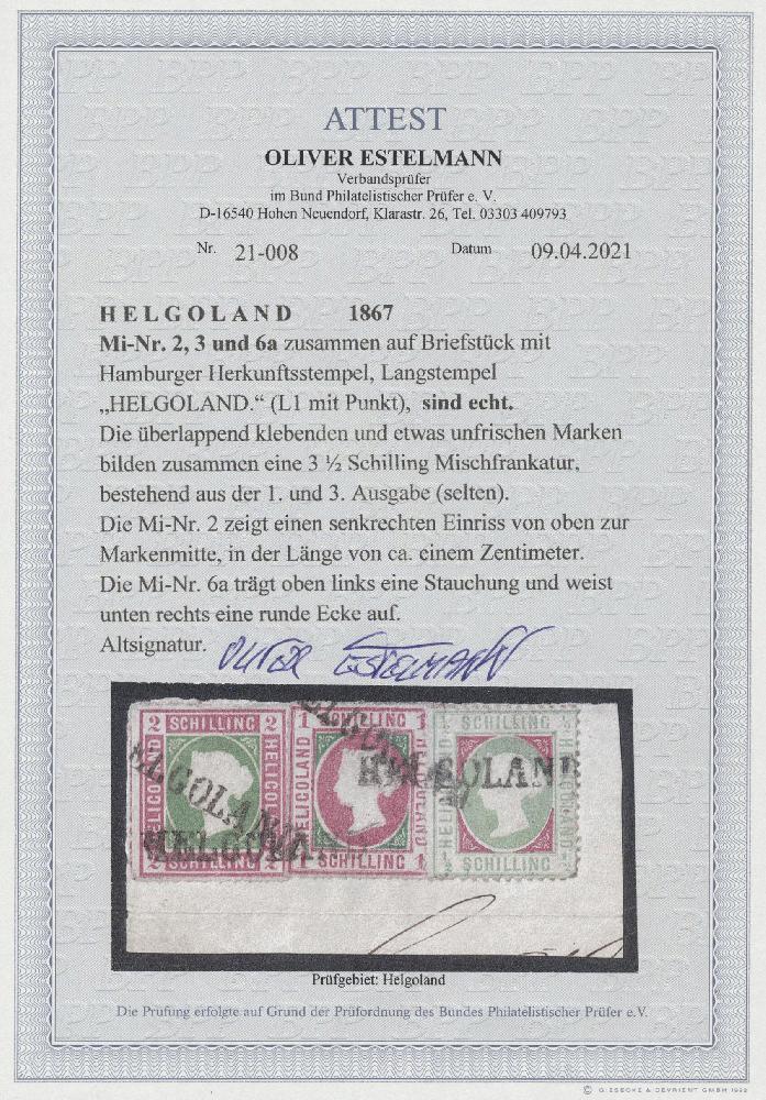 | Zusatzinformationen und Suchstichworte: | Auction Galleries Hamburg 28. Auktion 9. - 10. Juni 2023 Los 978 D Altdeutschland Helgoland 1867-1869, Viktoria 1 und 2 Schilling durchstochen sowie 1/2 Schilling gezähnt, je entwertet mit dem Hamburger Herkunftsstempel L1 "HELGOLAND", zusammen auf einem Briefstück mit diversen Altsignaturen. Laut Fotoattest Estelmann BPP sind Marken und Stempel echt, zeigt die Mi.Nr. 2 einen senkrechten Einriss oben zur Markenmitte in der Länge von ca. 1 cm., trägt die Mi.Nr. 6 a oben links eine Stauchung und weist unten rechts eine runde Ecke auf. Die 3 Marken bilden zusammen eine seltene 3 1/2 Schilling-Mischfrankatur Zuschlag 800,00 EUR |