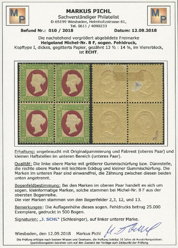 | Zusatzinformationen und Suchstichworte: | Ulrich Felzmann Shop Los 504364 Altdeutschland Helgoland ¼ S grün/karmin Fehldruck, farbfrischer, ungebrauchter Viererblock der Bogenfelder 2-3 und 12-13 mit Originalgummierung, das obere Paar im kleineren Markenformat mit Falzresten und Mängeln, das untere Paar je nur minimaler Haftpunkt im unteren Bereich und einwandfrei, Fotoexpertise, € 700,- Festpreis 100,00 EUR |