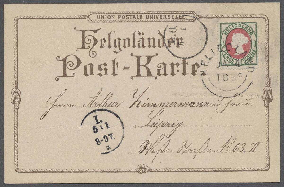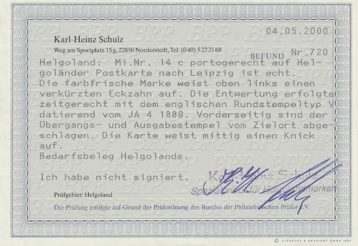 | Zusatzinformationen und Suchstichworte: | Auction Galleries Hamburg 28. Auktion 9. - 10. Juni 2023 Los 990 D Altdeutschland Helgoland 1875, Viktoria bläulichgrün/rötlichkarmin entwertet mit Rundstempel "HELIGOLAND JA 4 1888" in Type V, als portogerechte Einzelfrankatur auf senkrecht mittig gefalteter Ansichtskarte von Helgoland welche nach Leipzig gelaufen ist. Laut Fotobefund Schulz BPP sind die Postkarte sowie die Marke echt und weist die farbfrische Marke oben links einen verkürzten Eckzahn auf Ausruf 80,00 EUR |