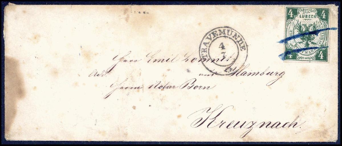 | Zusatzinformationen und Suchstichworte: | Württembergisches Auktionshaus 142. Versteigerung 23.-24. Juni 2023 Los 2645 Altdeutschland Lübeck 4 Sch., besonders tieffarbiges Kabinettstück mit Federzug-Entwertung und beiges. K2 TRAVEMÜNDE auf etwas fehlerhaftem Brief nach Kreuznach. Die Tinten-Entwertung war vom 3.3.1859 bis 26.1.1861 vorgeschrieben, mit dem Travemünde-Nebenstempel ein sehr seltener Brief, Fotoattest Brettl Zuschlag 280,00 EUR |