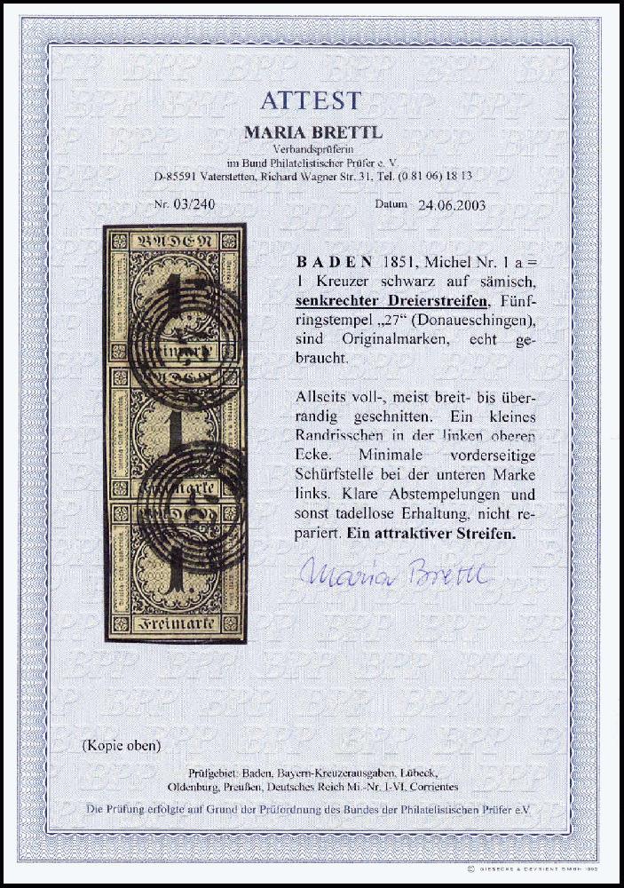 | Zusatzinformationen und Suchstichworte: | Württembergisches Auktionshaus 142. Versteigerung 23.-24. Juni 2023 Los 1414 Altdeutschland Baden 1 Kr. a. sämisch, senkr. Dreierstreifen, allseits voll-, meist breitrandig geschnitten mit zentr. Stempeln "27" DONAUESCHINGEN. Trotz min. Einschränkungen bei zwei Marken ein sehr attraktiver Streifen, Fotoattest Brettl BPP Ausruf 500,00 EUR |