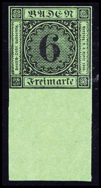 | Zusatzinformationen und Suchstichworte: | Württembergisches Auktionshaus 142. Versteigerung 23.-24. Juni 2023 Los 1428 Altdeutschland Baden 6 Kr. a. blaugrün, ringsum vollrandig geschnittenes, völlig postfrisches Luxusstück in leuchtender Farbe, unten mit 25,5 mm breitem Bogenrand. Diese Marke stellt das absolute Top-Stück der ersten Ausgabe Badens dar. Es ist in dieser traumhaften Erhaltung nicht mit normalen Maßstäben zu messen, vor allem auch weil postfrische Exemplare dieser Ausgabe praktisch nicht existieren, Fotoattest Brettl BPP ("Sehr farbfrische und feinste, tadellose Erhaltung, postfrisch ohne Falz. Eine in dieser Erhaltung sehr seltene Marke") Ausruf 18.000,00 EUR |