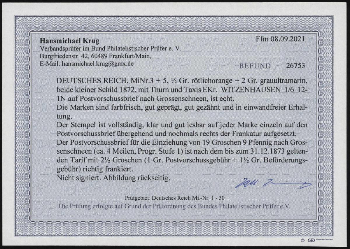 | Zusatzinformationen und Suchstichworte: | HBA 81. Auktion 11. - 13. Mai 2023 Los 719 (D) Deutsches Reich, 1872 Kleiner Brustschild 1872, 1/2 Gr., rötlichorange, in Farbfrankatur mit 2 Gr., grauultramarin, je kleiner Schild, als portogerechte 2 1/2 Gr.-Frankatur auf schönem, teilvorgedrucktem Postvorschussbrief mit Taxis-Einkreiser "WITZENHAUSEN 1/6", adressiert nach Großenschneen, tadellose Kabinetterhaltung, der Umschlag ist dreiseitig geöffnet, rückseitig wurde die Nota angebracht, gepr. Krug mit neuem Fotobefund Zuschlag 95,00 EUR |