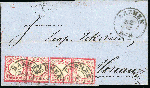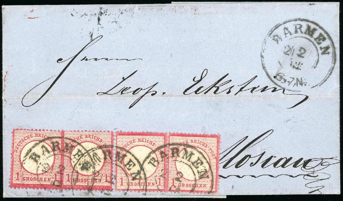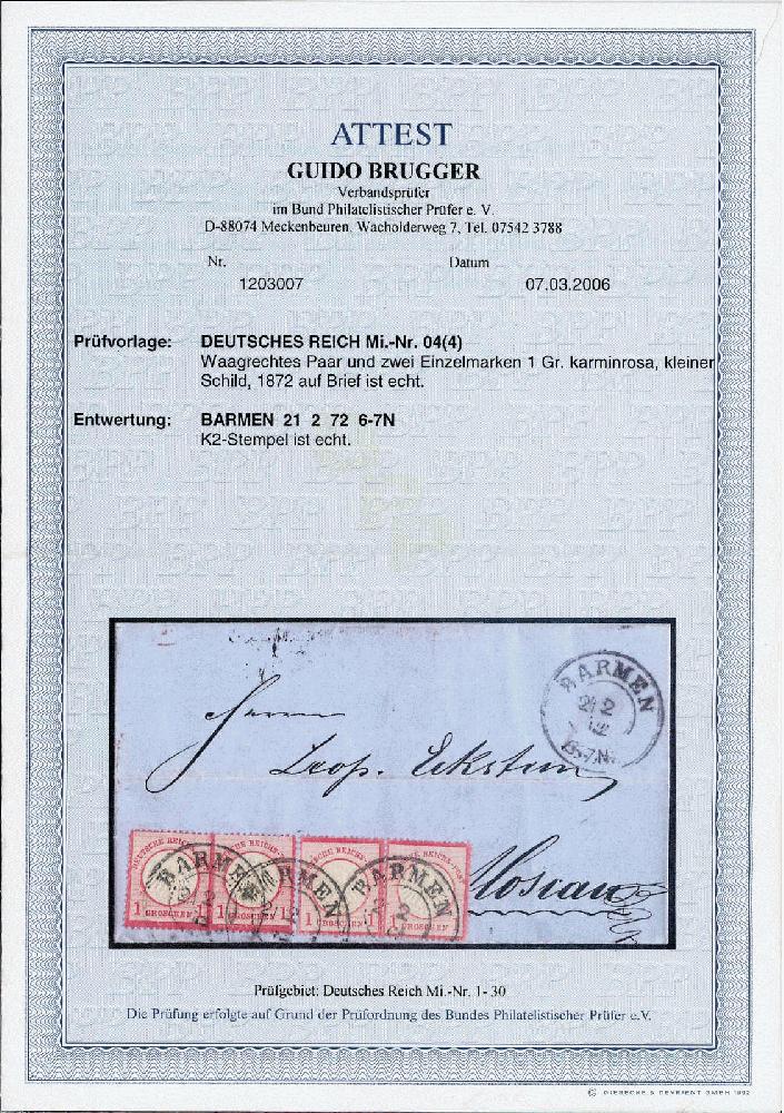 | Zusatzinformationen und Suchstichworte: | HBA 81. Auktion 11. - 13. Mai 2023 Los 720 (D) Deutsches Reich, 1872 Kleiner Brustschild 1872, 1 Gr., karmin, kleiner Schild, waagerechtes Paar und zwei Einzelmarken als portogerechte 4 Gr.-Mehrfachfrankatur auf Auslandsbriefhülle von "BARMEN 21 2 72" nach Moskau/Russland mit Ankunftsstempel, tadellose Kabinetterhaltung, nicht häufige Destination und seltene Portostufe, die nur wenige Monate möglich war, gepr. Brugger mit Fotoattest Zuschlag 130,00 EUR |