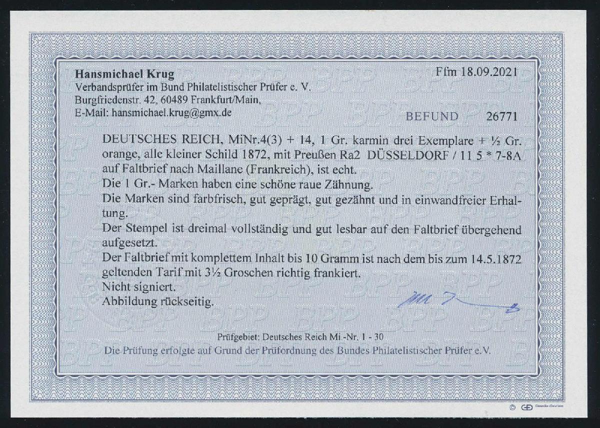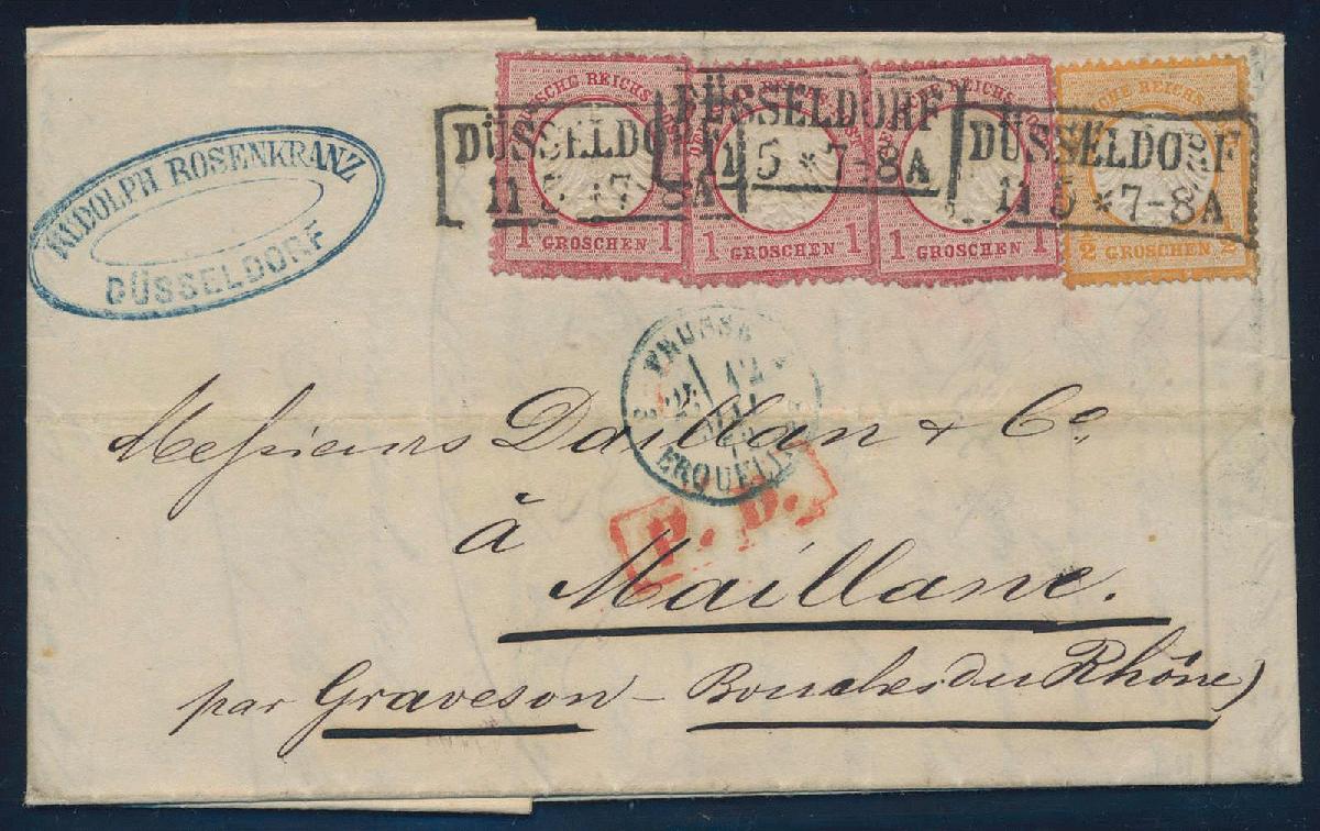 | Zusatzinformationen und Suchstichworte: | HBA 81. Auktion 11. - 13. Mai 2023 Los 721 (D) Deutsches Reich, 1872 Kleiner Brustschild 1872, 1/2 Gr., orange, in Mischfrankatur mit drei Stück 1 Gr., karmin, überlappend geklebt als 3 1/2 Gr.-Frankatur auf Auslandsbriefhülle mit vollem Inhalt von "DÜSSELDORF 11 5" (1872) nach Maillane/Frankreich mit Durchgangsstempeln und rotem "P.D.", tadellose Kabinetterhaltung, die 1 Gr. schön rau gezähnt, gepr. Krug mit neuem Fotobefund Zuschlag 120,00 EUR |