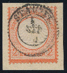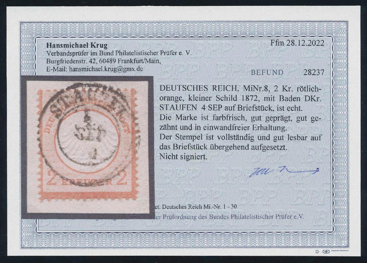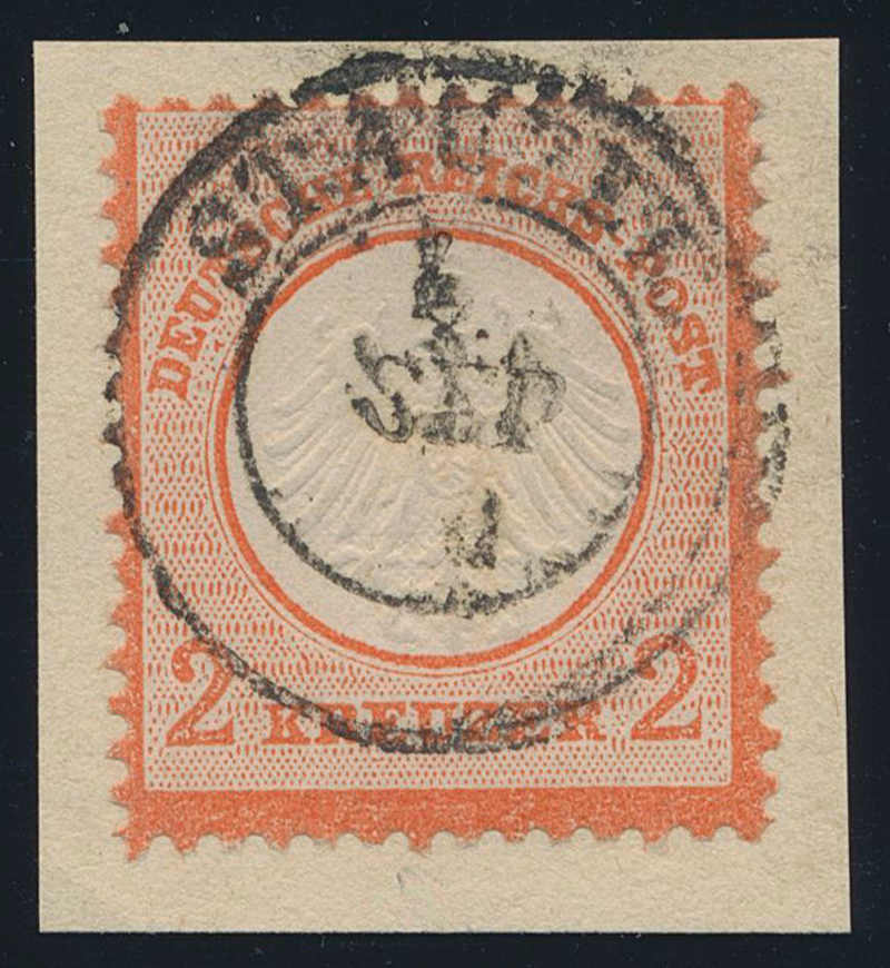 | Zusatzinformationen und Suchstichworte: | HBA 81. Auktion 11. - 13. Mai 2023 Los 725 (D) Deutsches Reich, 1872 Kleiner Brustschild 1872, 2 Kr., rötlichorange, kleiner Schild, auf Briefstück, fast zentrisch entwertet mit badischem Doppelkreisstempel "STAUFEN 4 SEP", farbfrische, tadellose Kabinetterhaltung, gepr. Krug mit neuem Fotobefund, Mi. 400,-- Zuschlag 260,00 EUR |