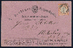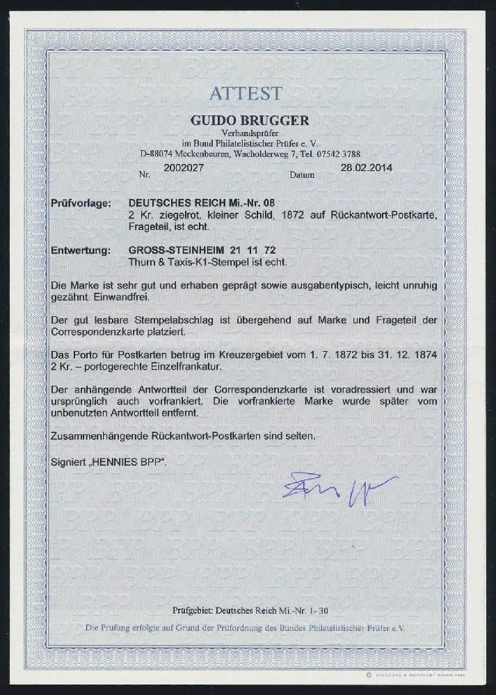 | Zusatzinformationen und Suchstichworte: | HBA 81. Auktion 11. - 13. Mai 2023 Los 726 (D) Deutsches Reich, 1872 Kleiner Brustschild 1872, 2 Kr., rötlichorange, kleiner Schild, als portogerechte Einzelfrankatur auf rosafarbener Rückantwortpostkarte mit anhängendem, unbenutztem Antwortteil, mit nachverwendetem Taxis-Einkreisstempel von "GROSS-STEINHEIM 21 11 72" nach "Hintenlang" mit Ankunftsstempel von Hindelang und Durchgangsstempel von Immenstadt, auch der Antwortteil war vorfrankiert, die Marke wurde entfernt, schöne Prachterhaltung und ausgesprochen kontrastreich, zusammenhängende Rückantwortpostkarten sind selten, zumal mit dieser Frankatur, gepr. Hennies und gepr. Brugger mit Fotoattest, Mi. 500,--+++ Ausruf 160,00 EUR |