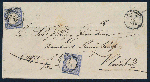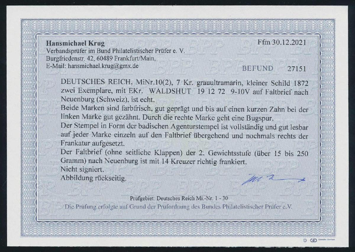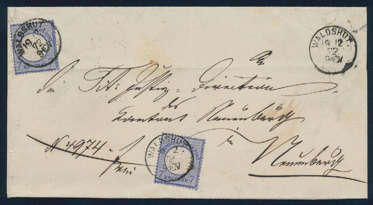 | Zusatzinformationen und Suchstichworte: | HBA 81. Auktion 11. - 13. Mai 2023 Los 728 (D) Deutsches Reich, 1872 Kleiner Brustschild 1872, 7 Kr., ultramarin, kleiner Schild, zwei Stück als portogerechte Mehrfachfrankatur auf Auslands-Briefhülle der 2. Gewichtsstufe von WALDSHUT 19 12 72" nach Neuenburg/Schweiz mit Durchgangsstempel von Neuchatel, die linke Marke zeigt einen kurzen Zahn, durch die rechte geht eine Bugspur, die Seitenklappen der Hülle fehlen, im Übrigen ansprechende Prachterhaltung, nicht häufige Mehrfachfrankatur aus dem Kreuzergebiet in insgesamt sauberer Prachterhaltung, gepr. Krug mit Fotobefund, Mi.-Briefekatalog mind. 600,-- Zuschlag 90,00 EUR |
