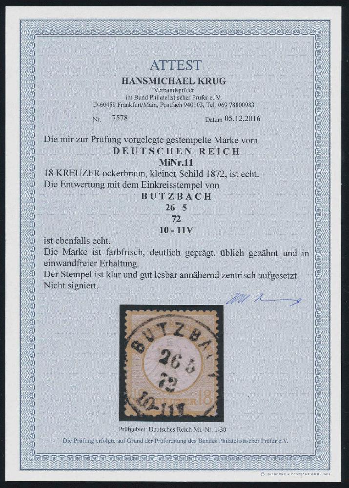 | Zusatzinformationen und Suchstichworte: | HBA 81. Auktion 11. - 13. Mai 2023 Los 730 (D) Deutsches Reich, 1872 Kleiner Brustschild 1872, 18 Kr., ockerbraun, kleiner Schild, besonders schön und fast zentrisch gestempelt "BUTZBACH 26 5 72", tadellose Kabinetterhaltung, in einwandfreier Erhaltung immer fehlende Marke, gepr. Krug mit Fotoattest, Mi. 500,- Zuschlag 140,00 EUR |