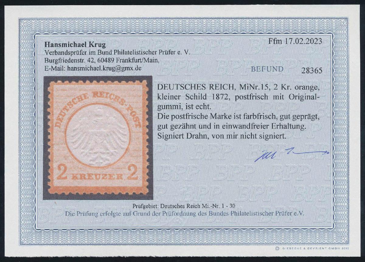 | Zusatzinformationen und Suchstichworte: | HBA 81. Auktion 11. - 13. Mai 2023 Los 734 (D) Deutsches Reich, 1872 Kleiner Brustschild 1872, 2 Kr., orange, kleiner Schild, tadellos postfrisches Kabinettstück, Altsign. Drahn, gepr. Hennies, Fotokurzbefund Sommer und gepr. Krug mit neuem Fotobefund, Mi. 180,-- Zuschlag 80,00 EUR |