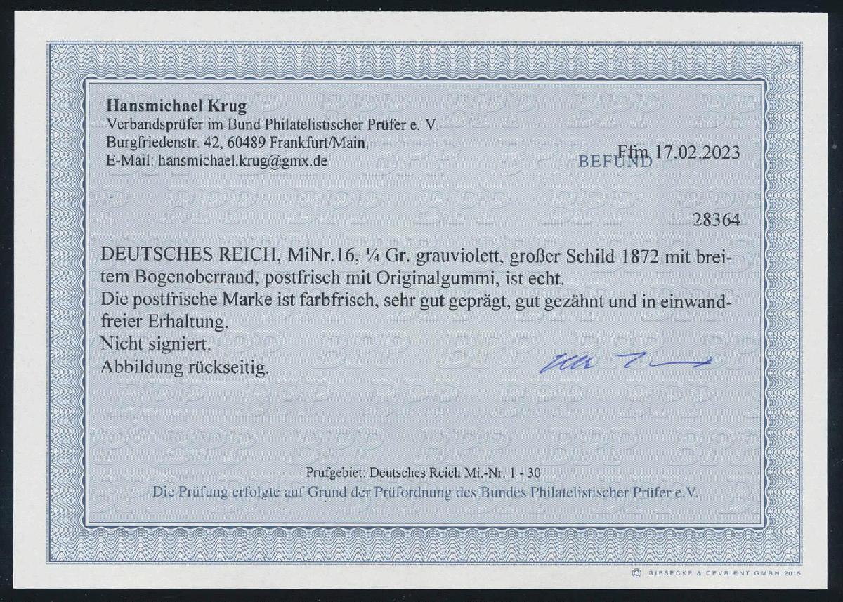 | Zusatzinformationen und Suchstichworte: | HBA 81. Auktion 11. - 13. Mai 2023 Los 736 (D) Deutsches Reich, 1872 Grosser Brustschild 1872, 1/4 Gr., grauviolett, großer Schild, tadellos postfrisches Kabinettstück vom Oberrand, auch der teilgummierte Rand postfrisch und ungefaltet, ohne Signaturen, Fotobefund Sommer und gepr. Krug mit neuem Fotobefund, Mi. 300,-- Zuschlag 180,00 EUR |