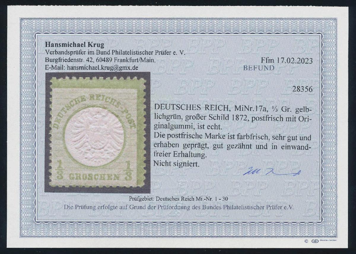 | Zusatzinformationen und Suchstichworte: | HBA 81. Auktion 11. - 13. Mai 2023 Los 741 (D) Deutsches Reich, 1872 Grosser Brustschild 1872, 1/3 Gr., gelblichgrün, großer Schild, tadellos postfrisches Kabinettstück, ohne Signaturen und gepr. Krug mit neuem Fotobefund, Mi. 180,- Ausruf 50,00 EUR |