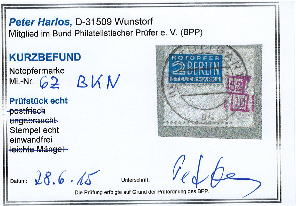 | Prüfer: | Harlos, Peter (BPP (Bund Philatelistischer Prüfer)) |