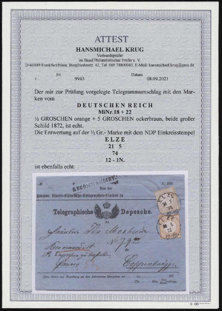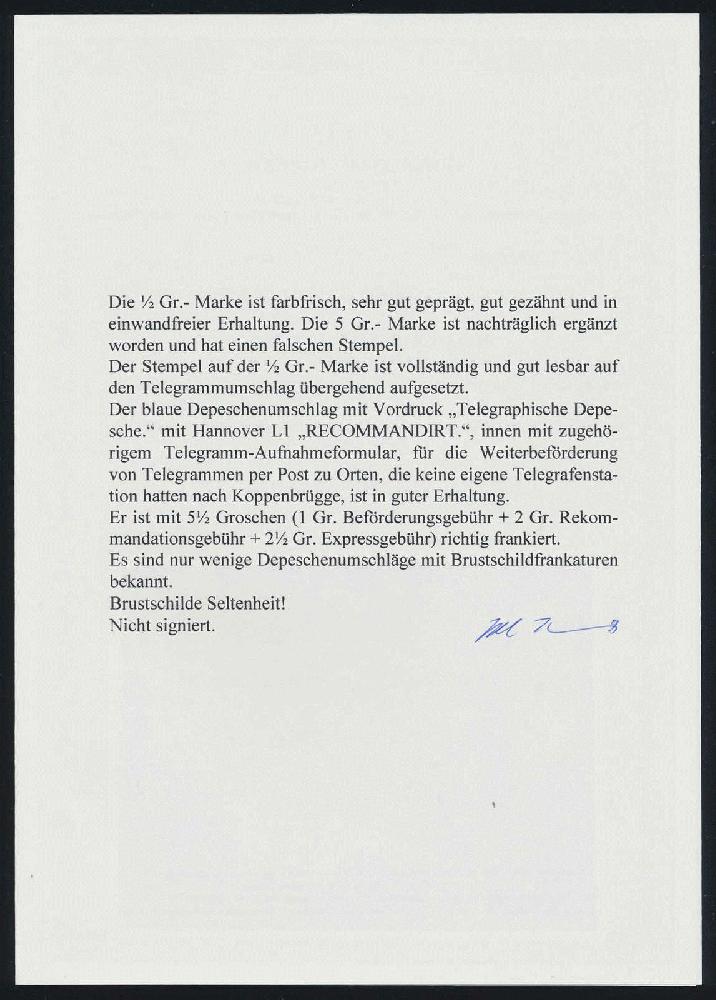 | Zusatzinformationen und Suchstichworte: | HBA 81. Auktion 11. - 13. Mai 2023 Los 746 (D) Deutsches Reich, 1872 Grosser Brustschild 1872, 5 Gr., ockerbraun, in Farbfrankatur mit 1/2 Gr., orange, großer Schild, als portogerechte 5 1/2 Gr.-Frankatur auf blauem Telegrammumschlag "Telegraphische Depesche" der "Hannov. Staats-Eisenbahn-Telegraphen-Station in..." von "ELZE 21 5 74", adressiert nach Coppenbrügge, innen das zugehörige Telegramm-Aufnahmeformular. Die 5 Gr.-Marke wurde gegen eine Marke gleichen Nennwertes ergänzt und mit einem Falschstempel bzw. Stempel-achmalung versehen, sonst befindet sich das Stück in sehr sauberer Prachterhaltung. Depeschenumschläge mit Brustschildfrankaturen sind nur ganz wenige bekannt, es handelt sich um große Brustschilde-Seltenheiten. Der zuvor beschriebene Austausch der 5 Gr.-Marke sollte dabei unter Betrachtung der großen postgeschichtlichen Bedeutung dieses Stückes nicht zu hoch bewertet werden. Fotoattest Sommer und gepr. Krug mit neuem Fotoattest Zuschlag 580,00 EUR |