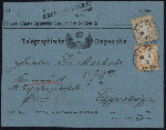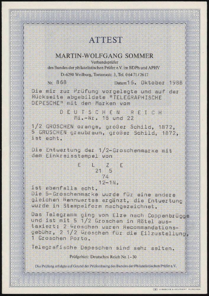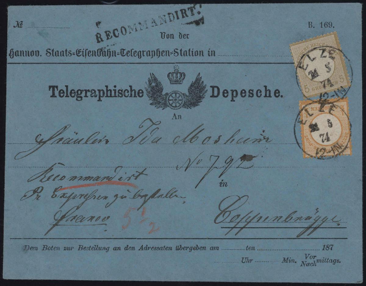 | Zusatzinformationen und Suchstichworte: | HBA 81. Auktion 11. - 13. Mai 2023 Los 746 (D) Deutsches Reich, 1872 Grosser Brustschild 1872, 5 Gr., ockerbraun, in Farbfrankatur mit 1/2 Gr., orange, großer Schild, als portogerechte 5 1/2 Gr.-Frankatur auf blauem Telegrammumschlag "Telegraphische Depesche" der "Hannov. Staats-Eisenbahn-Telegraphen-Station in..." von "ELZE 21 5 74", adressiert nach Coppenbrügge, innen das zugehörige Telegramm-Aufnahmeformular. Die 5 Gr.-Marke wurde gegen eine Marke gleichen Nennwertes ergänzt und mit einem Falschstempel bzw. Stempel-achmalung versehen, sonst befindet sich das Stück in sehr sauberer Prachterhaltung. Depeschenumschläge mit Brustschildfrankaturen sind nur ganz wenige bekannt, es handelt sich um große Brustschilde-Seltenheiten. Der zuvor beschriebene Austausch der 5 Gr.-Marke sollte dabei unter Betrachtung der großen postgeschichtlichen Bedeutung dieses Stückes nicht zu hoch bewertet werden. Fotoattest Sommer und gepr. Krug mit neuem Fotoattest Zuschlag 580,00 EUR |