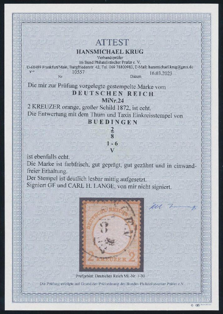 | Zusatzinformationen und Suchstichworte: | HBA 81. Auktion 11. - 13. Mai 2023 Los 767 (D) Deutsches Reich, 1872 Grosser Brustschild 1872, 2 Kr., orange, großer Schild, sauber gestempelt "BUEDINGEN 2/8", Thurn & Taxis Einkreiser, tadellose Kabinetterhaltung und in einwandfreier Qualität immer fehlend, Altsign. und gepr. Krug mit neuem Fotoattest, Mi. 3200,-- Zuschlag 720,00 EUR |