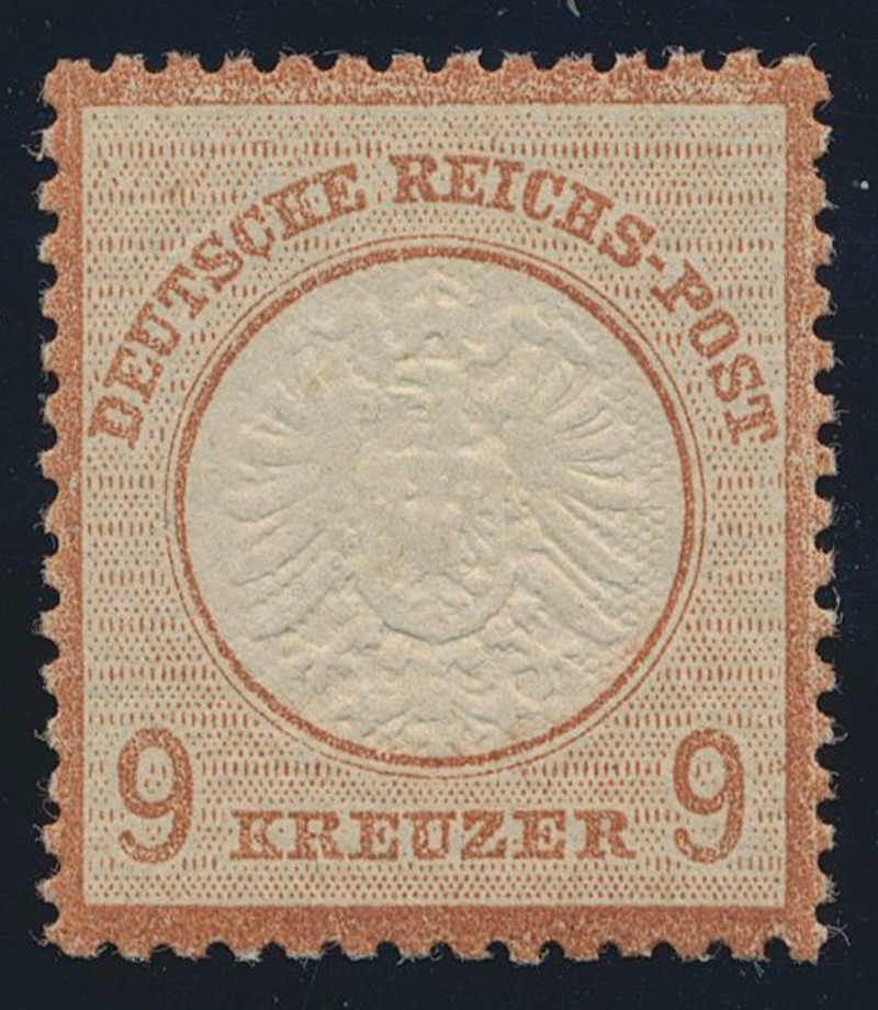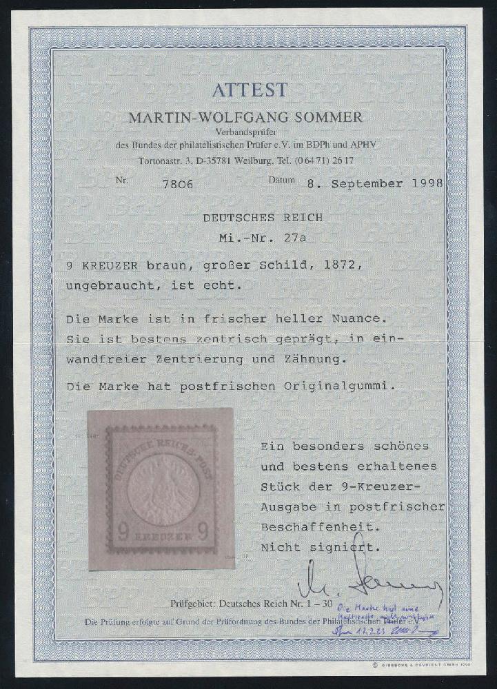 | Zusatzinformationen und Suchstichworte: | HBA 81. Auktion 11. - 13. Mai 2023 Los 770 (D) Deutsches Reich, 1872 Grosser Brustschild 1872, 9 Kr., rötlichbraun, großer Schild, wie postfrisch wirkendes, sehr sauber ungebrauchtes Kabinettstück mit vollem Originalgummi und minimaler Haftstelle, sehr frische Qualität, sign. Schultheiß, Fotoattest Sommer, der die Marke als postfrisch beschreibt und und gepr. Krug mit neuem Fotoattest, Mi. 550,-- Zuschlag 310,00 EUR |