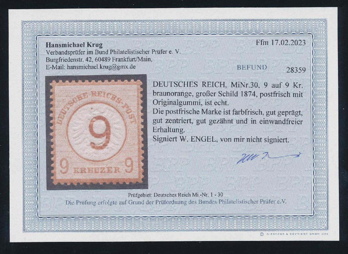 | Zusatzinformationen und Suchstichworte: | HBA 81. Auktion 11. - 13. Mai 2023 Los 776 (D) Deutsches Reich, 1872 Grosser Brustschild 1874, 9 a. 9 Kr., mittelrötlichbraun, großer Schild, tadellos postfrisches Kabinettstück, sign. Walter Engel, Fotobefund Sommer und gepr. Krug mit neuem Fotobefund, Mi. 220,-- Zuschlag 200,00 EUR |
