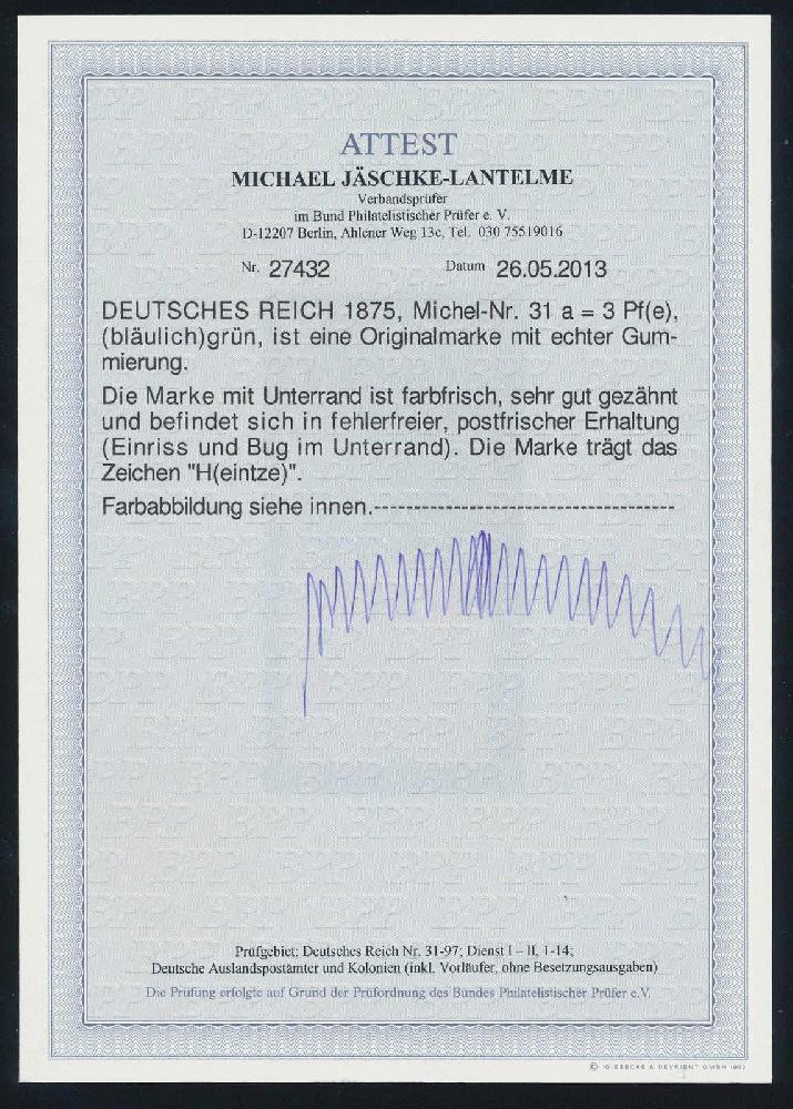 | Prüfer: | Jäschke-Lantelme, Michael (BPP (Bund Philatelistischer Prüfer)) |
