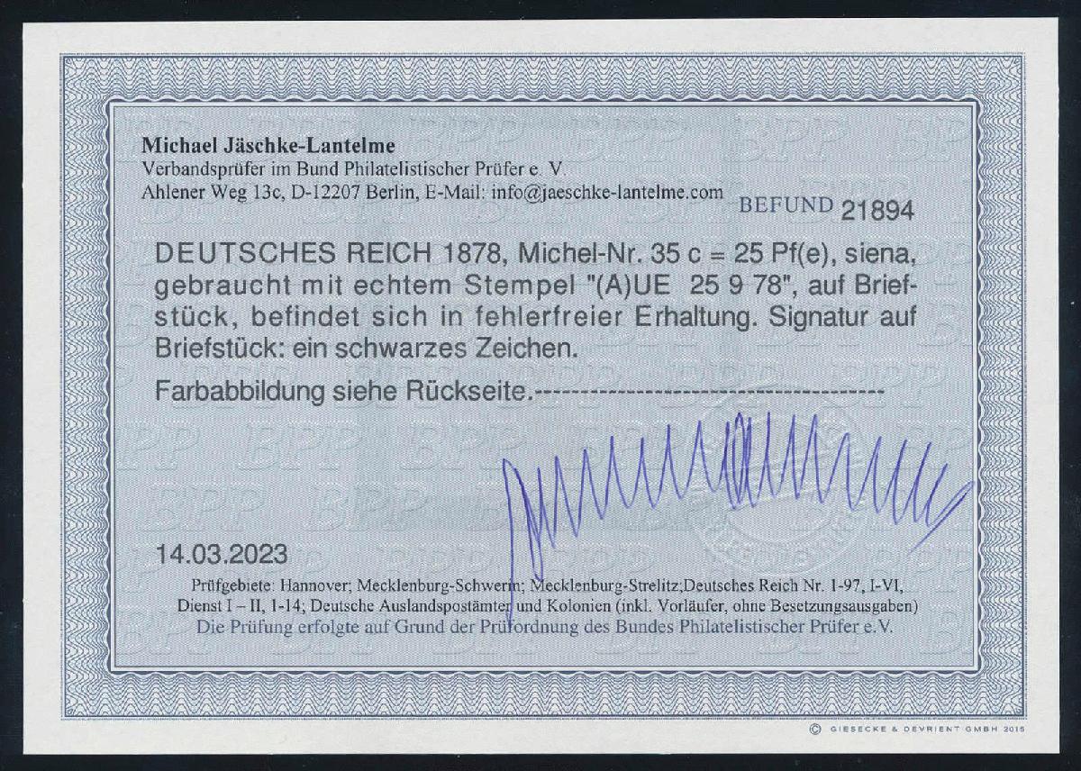 | Prüfer: | Jäschke-Lantelme, Michael (BPP (Bund Philatelistischer Prüfer)) |