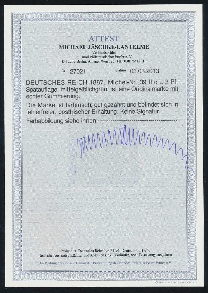 | Prüfer: | Jäschke-Lantelme, Michael (BPP (Bund Philatelistischer Prüfer)) |