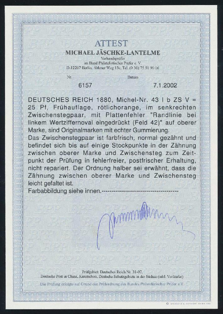 | Zusatzinformationen und Suchstichworte: | HBA 81. Auktion 11. - 13. Mai 2023 Los 796 (D) Deutsches Reich, 1880/89 Pfennig 1883, 25 Pfennig, rötlichorange, Frühauflage, senkrechtes, postfrisches Zwischenstegpaar, obere Marke und Zwischensteg mit Stockpunkten (die obere Marke mit einem Plattenfehler), obere Marke udn Zwischensteg angefaltet, untere Marke in fehlerfreier Prachterhaltung, gepr. Jäschke-Lantelme mit Fotoattest, Mi. 2200,-- Ausruf 270,00 EUR |