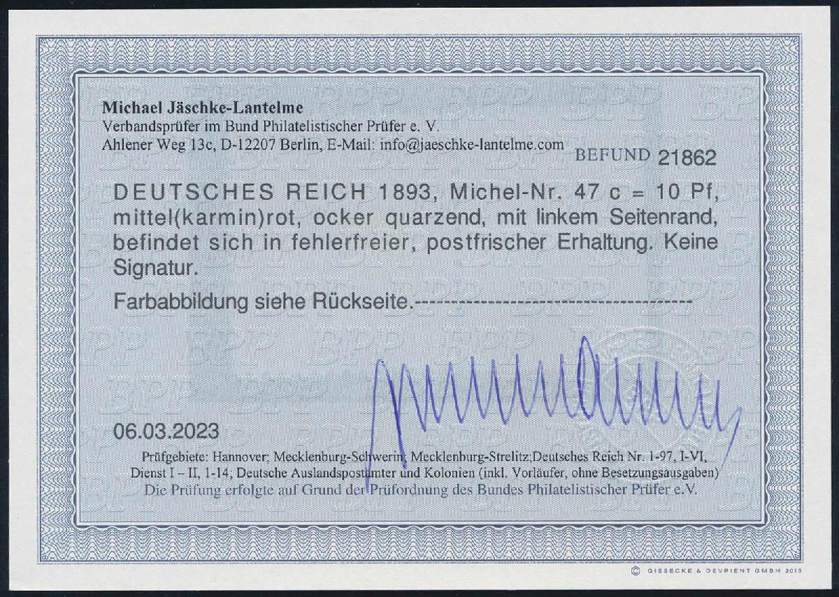 | Prüfer: | Jäschke-Lantelme, Michael (BPP (Bund Philatelistischer Prüfer)) |