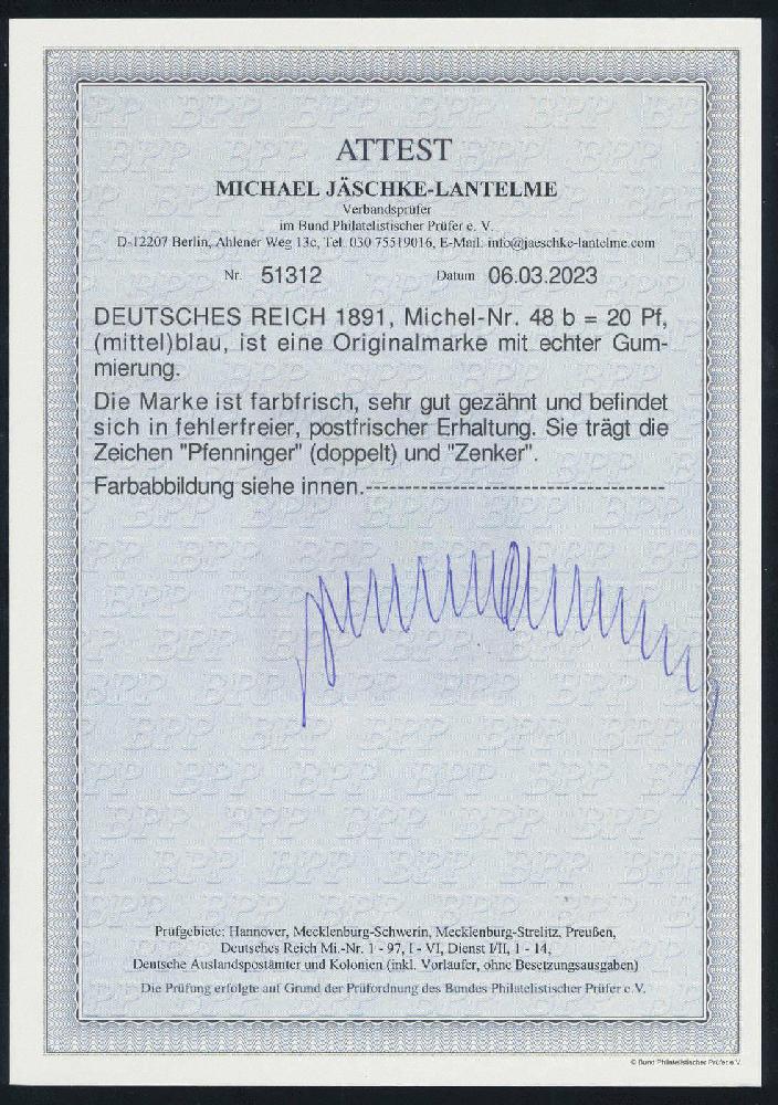 | Prüfer: | Jäschke-Lantelme, Michael (BPP (Bund Philatelistischer Prüfer)) |
