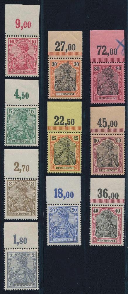 | Zusatzinformationen und Suchstichworte: | HBA 81. Auktion 11. - 13. Mai 2023 Los 811 (D) Deutsches Reich, Germania Reichspost 1900, Germania Reichspost, 10 W. kpl., tadellos postfrischer Kabinettsatz, einheitlich vom Oberrand, gleiches Feld, postfrischer Luxussatz, auch die Ränder postfrisch und ungefaltet, bei der 80 Pfg. im Oberrand eine Beschriftung, ohne Signaturen und gepr. Jäschke-Lantelme mit neuem Fotoattest, Mi. 850,--++ Zuschlag 600,00 EUR |