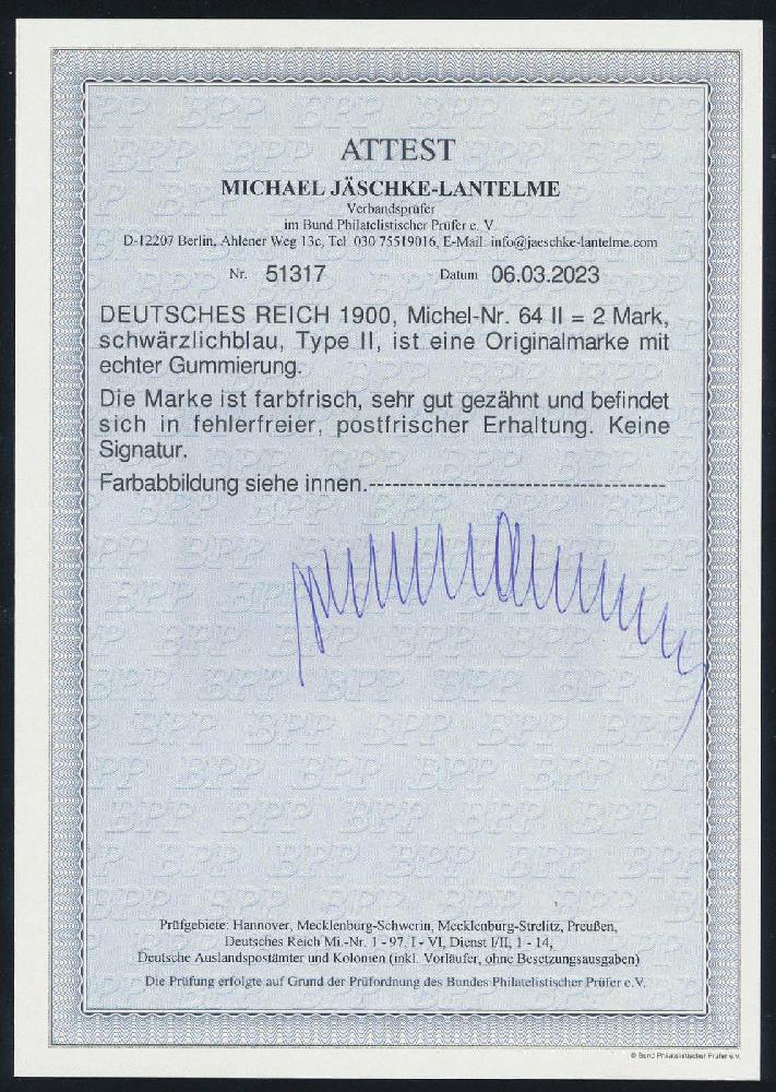 | Prüfer: | Jäschke-Lantelme, Michael (BPP (Bund Philatelistischer Prüfer)) |