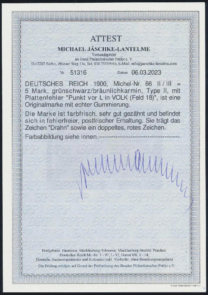 | Zusatzinformationen und Suchstichworte: | HBA 81. Auktion 11. - 13. Mai 2023 Los 824 (D) Deutsches Reich, Germania Reichspost 1900, Reichspost, 5 Mk., grünschwarz/bräunlichkarmin, Type II, mit sehr seltenem Plattenfehler "Punkt vor L in VOLK", Feld 18, tadellos postfrisches Kabinettstück, Altsign. und gepr. Jäschke-Lantelme mit neuem Fotoattest, Mi. -,-, in Anlehnung an die übrigen gelisteten Plattenfehler ca. 5000,-- bis 6000,-- Zuschlag 900,00 EUR |
