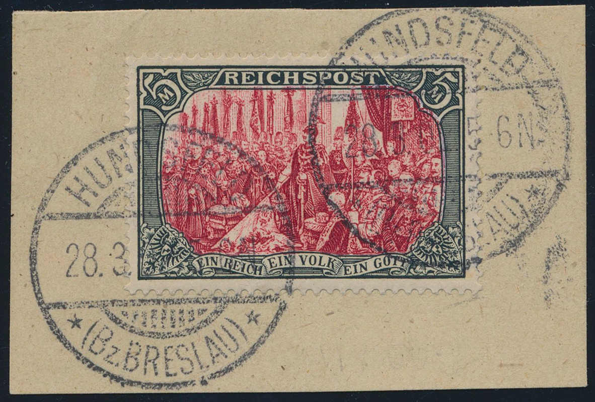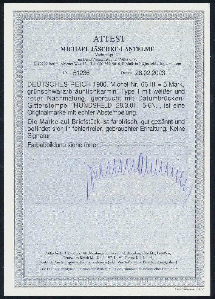 | Zusatzinformationen und Suchstichworte: | HBA 81. Auktion 11. - 13. Mai 2023 Los 826 (D) Deutsches Reich, Germania Reichspost 1900, Reichspost, 5 Mk., grünschwarz/bräunlichkarmin, Type III, d.h. rot und weiß nachgemalte Type I, auf schönem Briefstück, zweimal gestempelt "HUNDSFELD 28.3.01", tadellose Kabinetterhaltung, gepr. Jäschke-Lantelme mit neuem Fotoattest, Mi. 500,-- Zuschlag 300,00 EUR |