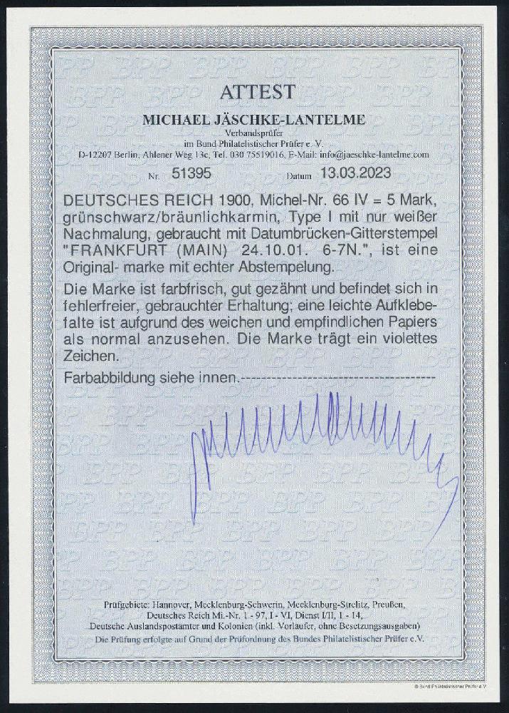 | Zusatzinformationen und Suchstichworte: | HBA 81. Auktion 11. - 13. Mai 2023 Los 827 (D) Deutsches Reich, Germania Reichspost 1900, Reichspost, 5 Mk., grünschwarz/bräunlichkarmin, Type IV, d.h. nur weiß nachgemalte Type I, sauber gestempelt "FRANKFURT (MAIN) 24.10.01", fehlerfreie Prachterhaltung, eine leichte Aufklebefalte ist aufgrund des weichen und empfindlichen Papiers laut Attest als normal anzusehen, gepr. Jäschke-Lantelme mit neuem Fotoattest, Mi. 800,-- Zuschlag 170,00 EUR |