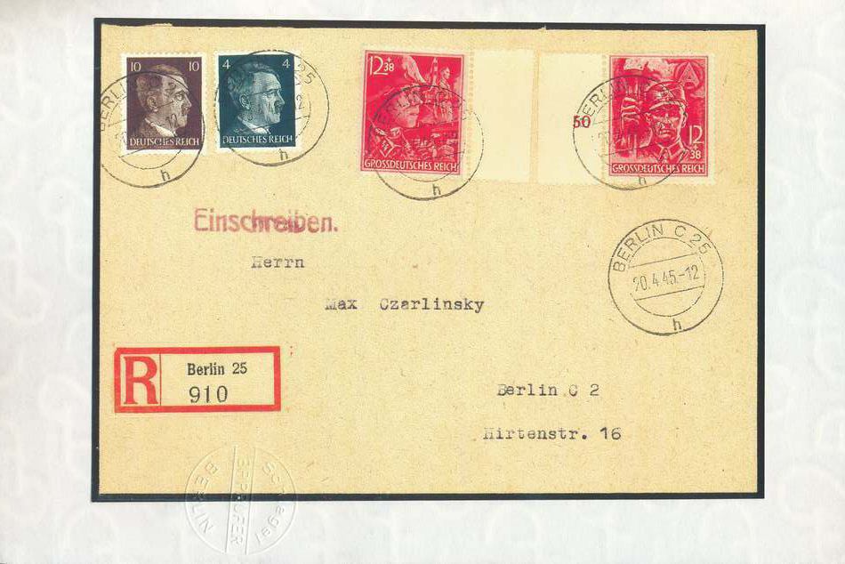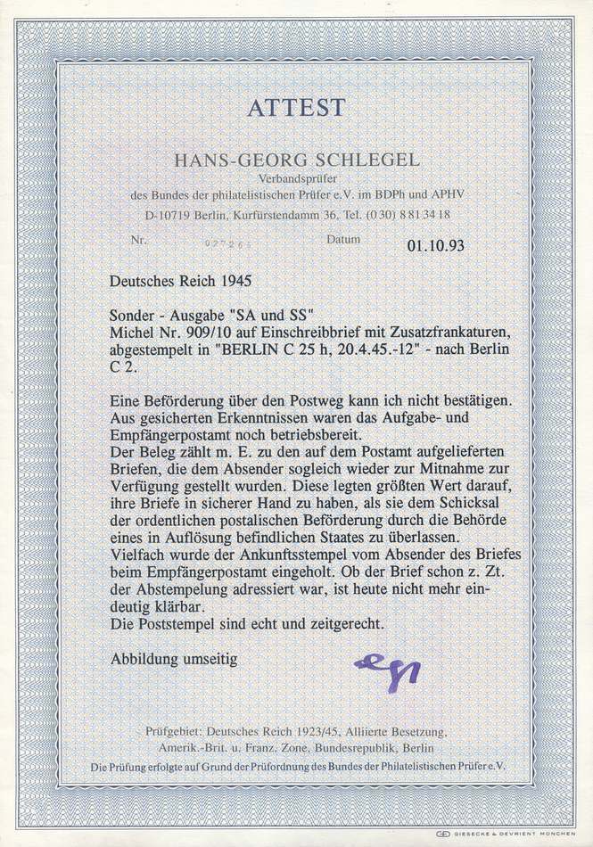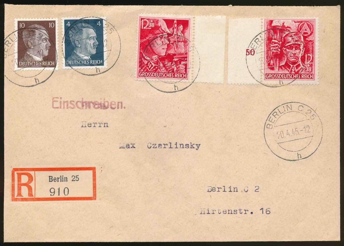 | Zusatzinformationen und Suchstichworte: | Deutsches Reich 1945 Sonder-Ausgabe "SA und SS" Michel Nr. 909/10 auf Einschreibbrief mit Zusatzfrankaturen, abgestempelt in "BERLIN C25 h, 20.4.45.-12" - nach Berlin C 2. |