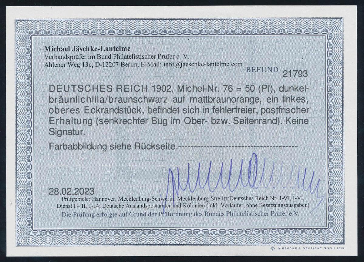 | Prüfgebiet: | Deutsches Reich 1871 - 1918 (Mi-Nr. 1 - 106) |