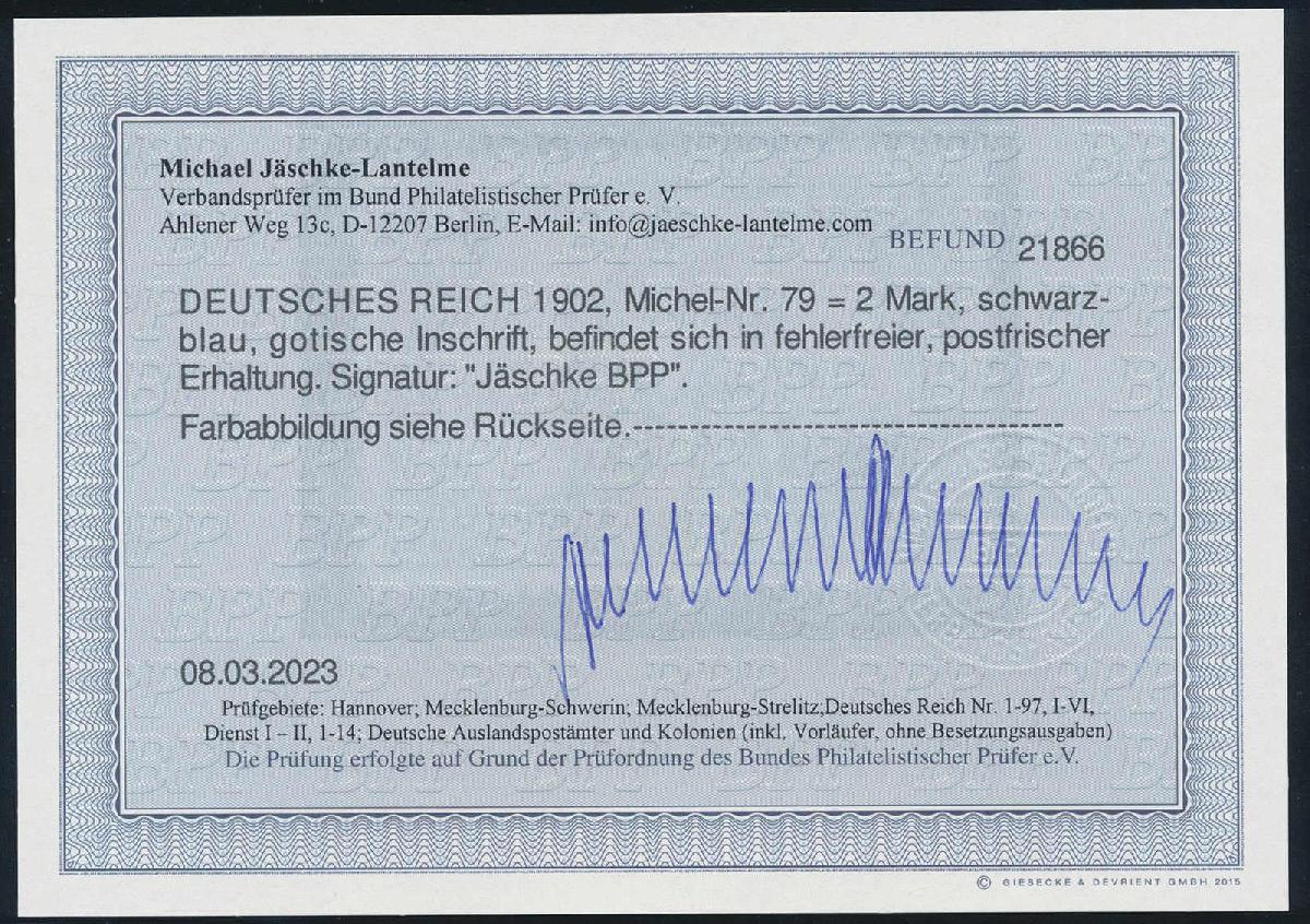 | Prüfer: | Jäschke-Lantelme, Michael (BPP (Bund Philatelistischer Prüfer)) |